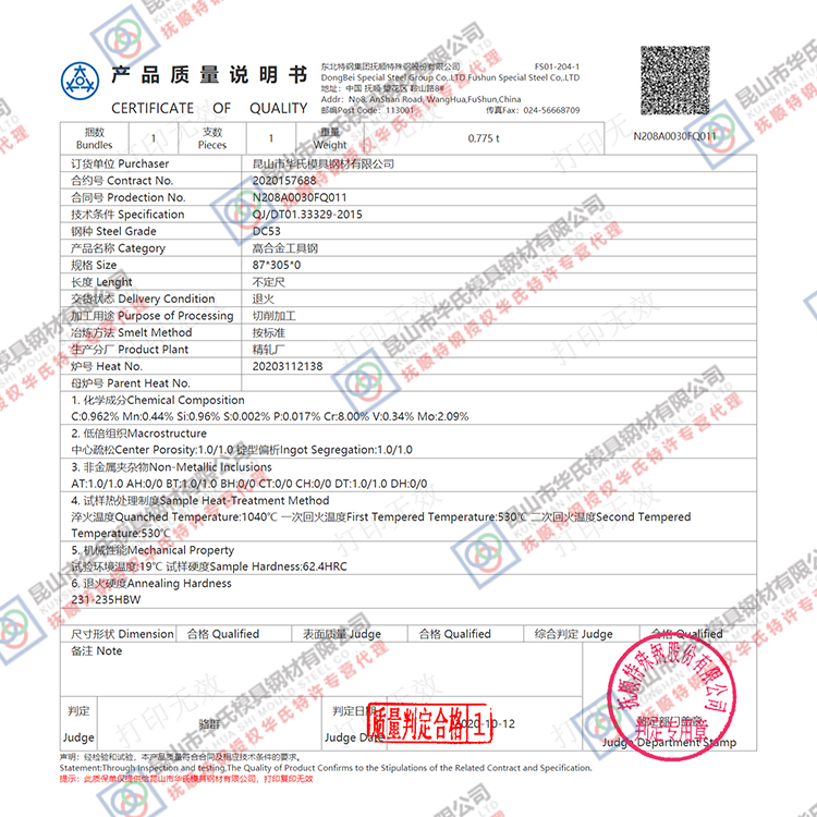 DC53鋼韌性比SKD11高一倍,適宜制作復(fù)雜沖模、拉伸模,抗裂崩角性能大幅提高。模具經(jīng)520-530℃高溫回火,硬度仍達61-63HRC,可降低線切割加工模具因殘余應(yīng)力造成的開裂事故風(fēng)險。適宜表面硬化處理,使用模具的壽命大幅提高。具有高淬透性和耐磨性,淬火時尺寸變化小,是應(yīng)用十分廣泛的冷作模具鋼。